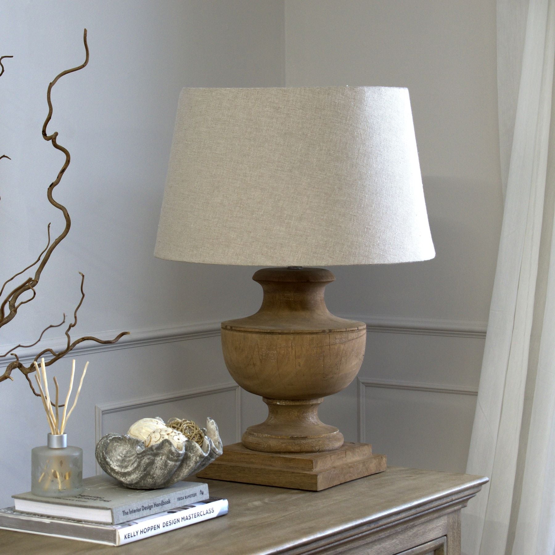 This natural hard wood lamp base, paired with linen shade is a timeless
